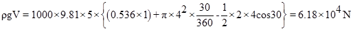 Since the curved surface of the gate is part of a cylinder, the water exerts no thrust along its length, so we consider the horizontal and vertical components in the plane of the diagram.