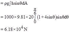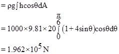 The horizontal components in the thrust that would be exerted by the water on a vertical projection of the curved surface .The depth‘d' of this projection is 4sin300m = 2m and its centroid is