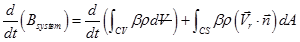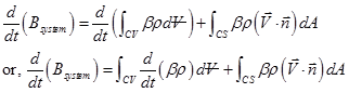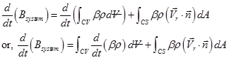 is the unit normal vector outwards to the area dA. The left hand side term of Eq. (2.2.3) is the time rate of change of any system property B. The first term in the right hand side of Eq. (2.2.1) is the change of same property B within the control volume while the second term is the change of flux of B passing through the control surface.