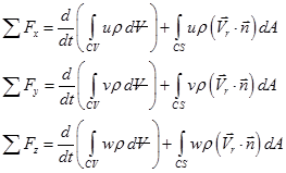 Here, u, v and w are the velocity components in the x, y and z directions, respectively. For a fixed control volume,