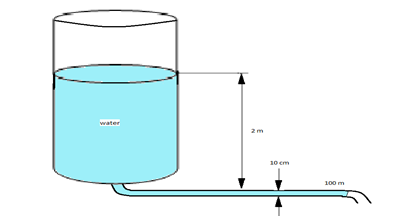 PROBLEM 2: A 2-m high large tank is initially filled with water. The tank water surface is open to the atmosphere, and a sharp-edged 10-cm-diameter orifice at the bottom drains to the atmosphere through a horizontal 100-m-long pipe. If the total irreversible head loss of the system is determined to be 1.5 m, determine the initial velocity of the water from the tank. Disregard the effect of the kinetic energy correction factors. (Answer: 3.13 m/s)