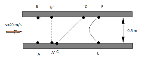 PROBLEM 3: Water flows through a duct of square cross section as shown in fig. with a constant, uniform velocity of V=20 m/s. Consider fluid particles that lie along line A-B at time t=0. Determine the position of these particles, denoted by line A'-B', when t=0.20s. Use the volume of fluid in the region between lines A-B and A'-B' to determine the flow rate in the duct. Repeat the problem for fluid particles originally along line C-D; along line E-F. Compare the answers. (Answer: 5 m3 /s)