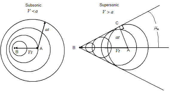 Fig. 4.4.1: Spread of disturbances at subsonic and supersonic speeds.