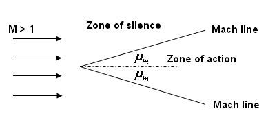 All disturbances confine inside the Mach cone extending downstream of the moving body is called as zone of action . The region outside the Mach cone and extending upstream is known as zone of silence . The pressure disturbances are largely concentrated in the neighborhood of the Mach cone that forms the outer limit of the zone of action (Fig. 4.4.2).
