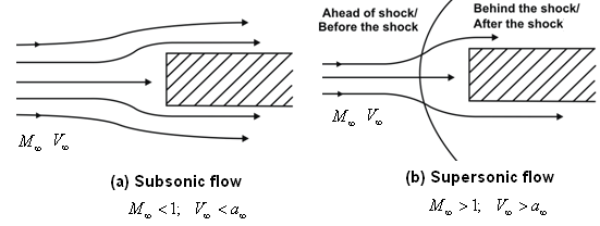 , the sound waves overtake the speed of the body and these weak pressure waves merge themselves ahead of the body leading to compression in the vicinity of the body. In other words, the flow medium gets compressed at a very short distance ahead of the body in a very thin region that may be comparable to the mean free path of the molecules in the medium. Since, these compression waves propagate upstream, so they tend to merge as shock wave . Ahead of the shock wave, the flow has no idea of presence of the body and immediately behind the shock; the flow is subsonic as shown in Fig. 4.3.3(b).