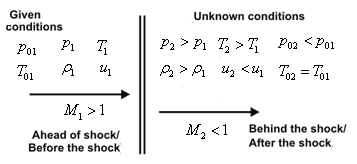 A normal shock wave is one of the situations where the flow properties change drastically in one direction. The shock wave stands perpendicular to the flow as shown in Fig. 4.4.4. The quantitative analysis of the changes across a normal shock wave involves the determination of flow properties. All conditions of are known ahead of the shock and the unknown flow properties are to be determined after the shock. There is no heat added or taken away as the flow traverses across the normal shock. Hence, the flow across the shock wave is adiabatic