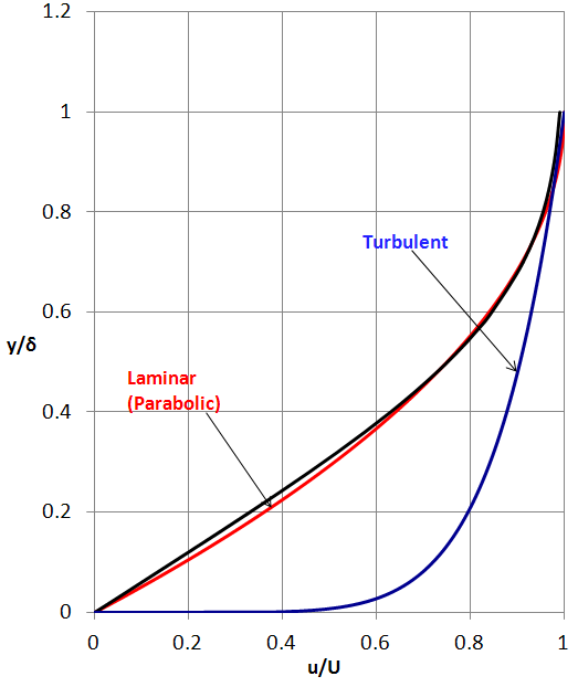 Fig. 5.11.1: Comparison of laminar and turbulent boundary layer profiles for flat plate.
