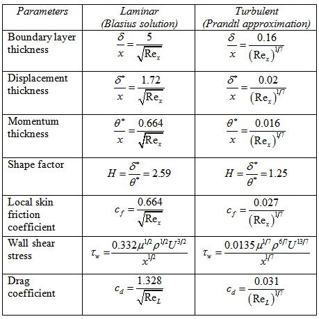 These are some basic results of turbulent flat plate theory. The flat plate analysis for a Blasius laminar boundary layer and turbulent boundary layer is summarized in Table 5.11.1.