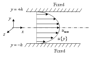 as shown in Fig. 5.2.4. Here, both the plates are fixed but the pressure varies in x- direction. It is assumed that the plates are very wide and long so that the flow is essentially axial