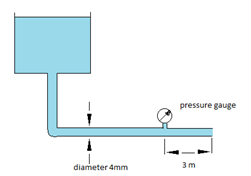 PROBLEM 1: A simple flow system to be used for steady flow tests consists of a constant head tank connected to a length of 4-mm-diameter tubing s shown in the figure. The liquid has a viscosity of 0.015 N.s/m2, a density of 1200 kg/ m3, and discharges into the atmosphere with a mean velocity of 2 m/s. (a) Verify that the flow will be laminar.(b) The flow is fully developed in the last 3 m of the tube. What is the pressure at the pressure gage? (c) What is the magnitude of the wall shearing stress,