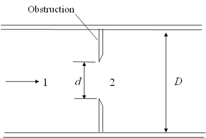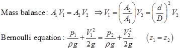 and diameter (d) at certain location (Fig. 7.2.3). The mass balance and Bernoulli equation can be applied between a location before the constriction (point ‘1') and at the constriction site (point ‘2').