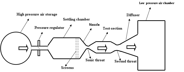 The high pressure chamber, vacuum section, nozzle and test section are few important components of a blow down wind tunnel. The schematic diagram is shown in Fig. 8.2.1. Since, the air from the high pressure chamber flows towards the vacuum section, it is referred as pressure-vacuum tunnel. First, the air is taken from the atmosphere and after compression; it is stored in a tank. Simultaneously, the low pressure section is evacuated by a vacuum pump. Pressure regulator controls the air flow from reservoir to the settling chamber during the actual experiment and maintains the desired constant pressure. The nozzle expands the flow by increasing velocity and decreasing pressure and provides desired Mach number in the test section. The high speed air encounters deceleration while passing through the second throat.