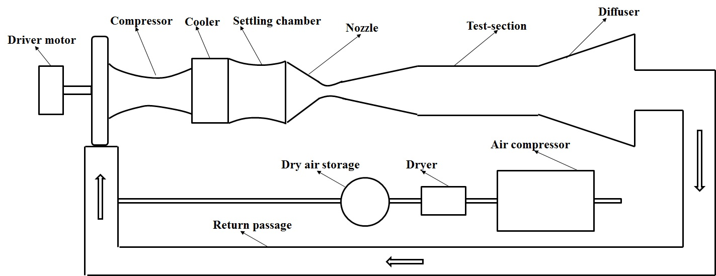 The major disadvantage of an open circuit wind tunnel is the test flow duration available for the model. However, if the Mach number/velocity requirement is not too high, than continuous operation of the blow down tunnel can be done by re-circulating the air. So, the schematic representation of Fig. 8.2.1 is modified through a return passage for air circulation. One more additional drier unit is also desired in the return passage to avoid condensation of re-circulating air in the test section of the tunnel (Fig. 8.2.2). In addition to the advantages of longer run times, this tunnel also provides good flow quality in the test section and the noise level is also less. However, the high construction cost is the major disadvantage of this tunnel.