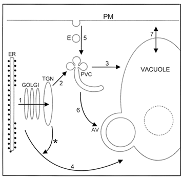 Proteins destined for degradation are delivered to the vacuole via the secretory pathway, which includes the biosynthetic, autophagic, and endocytotic transport routes (Figure 6).