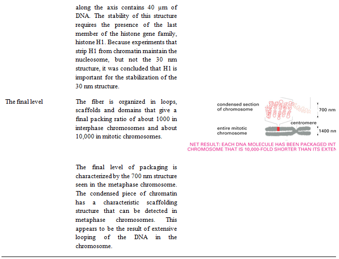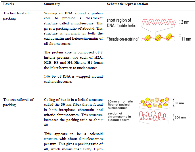 Roger Kornberg in 1974 described the basic structural unit of chromatin which is called the nucleosome. The structural organization of nucleosome to chromosome is explained in Table 2.