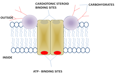 Figure 9: (Na+ - K+) – ATPase. This diagram shows the transporter's dimeric structure and its orientation in the plasma membrane. Cardiotonic steroids bind to the external surface of the transporter, thereby inhibiting transport.