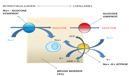 For example, cells of the intestinal epithelium take up dietary glucose by Na+ -dependent symport. This process is an example of secondary active transport because Na+ gradient in these cells is maintained by the (Na+ – K+)–ATPase.The Na+ – glucose transport system concentrates glucose inside the cell. Glucose is then transported into the capillaries through a passive-mediated glucose uniport (which resembles GLUT1).