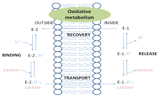 It is an active co-transport that facilitates the passage of lactose across the phospholipid bi-layer of the cell membrane by using the inwardly directed H+ electrochemical gradient as its driving force. The proton gradient is metabolically generated through oxidative metabolism. The electrochemical potential gradient created by both these systems is used mainly to drive the synthesis of ATP. As a result, the lactose is accompanied from the periplasam to the cytoplasm of the cell by an H+ proton.