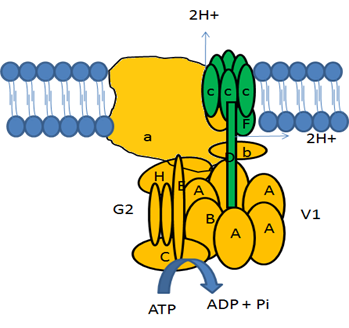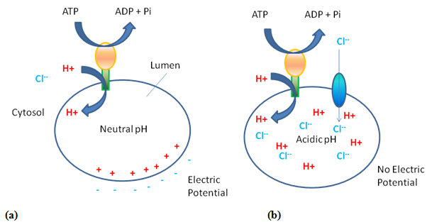 Figure 3: Effect of proton pumping by V-class ion pumps on H+ concentration gradients and electric potential gradients across cellular membranes. (a) If an intracellular organelle contains only V-class pumps, proton pumping generates an electric potential across the membrane, luminal-side positive, but no significant change occurs in the intraluminal pH. (b) If the organelle membrane also contains Cl- channels, anions passively follow the pumped protons, resulting in an accumulation of H+ ions (low luminal pH) but no electric potential across the membrane .