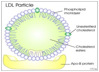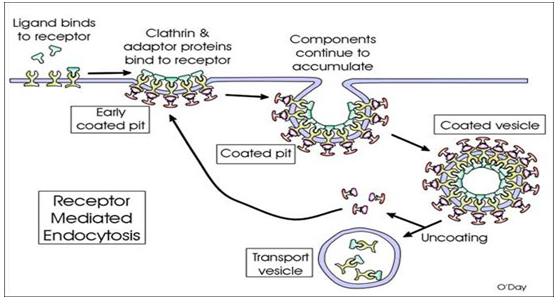 The example for clathrin mediated endocytosis is uptake of cholesterol by the mammalian cells. Here cholesterol is transported through the blood stream in the form of lipoprotein or LDL. The LDL particle consists of phospholipid bilayer, esterified and non-esterified cholesterol and Apo B protein as shown in figure 4. It was first demonstrated by Michael Brown and Joseph Goldstein in which uptake of LDL requires the binding of LDL particle to the specific cell receptor. Later it was found that it is concentrated in clathrin coated pits and internalized by endocytosis. Then receptor is recycled to plasma membrane and LDL is transported to lysosome and cholesterol is released for use by the cell.