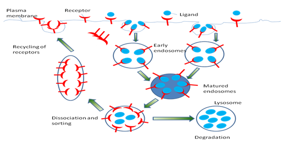 Figure 11: Protein trafficking during endocytosis. The figure shows the recycling of the plasma membrane and degradation of ligands and other membrane proteins in lysosome