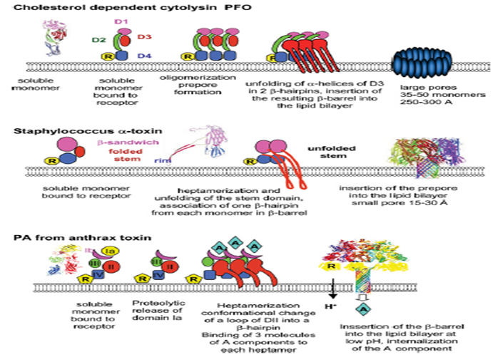 Figure 1: Pore formation of three β -PFTs. Pore formation can occur in the following ways: large pores induced by PFO, an example of a CDC; small pores resulting from heptamerization of Staphylococcus α-toxin; and pores formed by the binding component of anthrax toxin (PA) through endosome membrane, permitting the internalization of the corresponding enzymatic components. All the three types of β-PFTs show a common mode of β-barrel formation and subsequent insertion into lipid bilayers