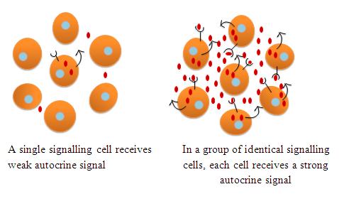 Figure 1 (b): Autocrine signaling A group of identical cells produces a higher concentration of a secreted signal than does a single cell.