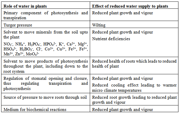Table 1. Role of water in plant growth vs reduced water supply to plants