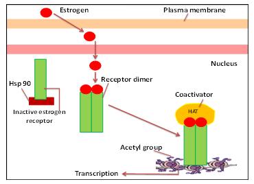 Mechanism of action of cytosolic receptors: Estrogen diffuses across the plasma membrane and binds to its receptor in the nucleus. The estrogen receptor is bound to Hsp 90 chaperones in the absence of the estrogen hormone as shown in Figure 2. The binding of the estrogen induces a conformational change in the receptor, displacing Hsp 90 and then leading to the formation of receptor dimers which binds to DNA, associate with coactivators with histone acetyltransferase (HAT) activity, and stimulate transcription of their target genes. In other cases, the receptor binds the DNA either in the presence or absence of hormone. But hormone binding alters the activity of the receptor as a transcriptional regulatory molecule. For example, in the absence of hormone, thyroid hormone receptor is associated with a corepressor complex and represses transcription of its target genes. Hormone binding induces a conformational change that results in the interaction of the receptor with co activators rather than co repressors, leading to transcriptional activation of thyroid hormone-inducible genes.