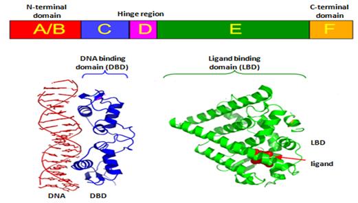 Bottom – 3D structures of the DBD (bound to DNA) and LBD (bound to hormone) regions of the nuclear receptor