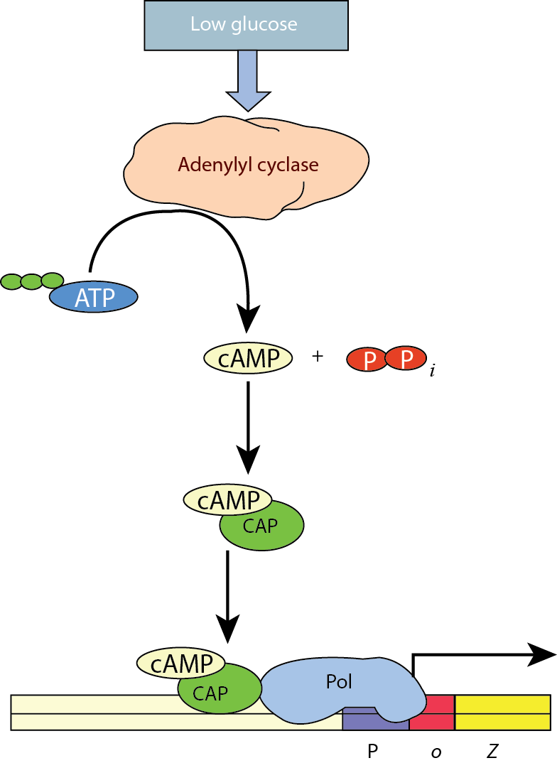 Figure 4: Positive regulation of lac operon by glucose repression coupled to enhance level of cAMP.