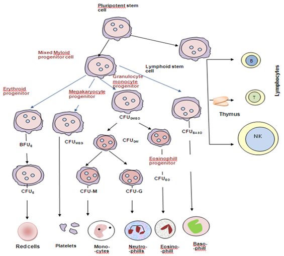 Figure 1: Diagrammatic representation of the bone marrow pluripotent stem cell and the cell lines that arise from it. Various progenitor cells can be identified by culture in semi-solid medium by the type of colony they form. Baso, basophil; BFU, burst-forming unit; CFU, colony-forming unit; E, erythroid; Eo, eosinophil; GM, granulocyte, monocyte; Meg, megakaryocyte; NK, natural killer cell (Hoffbrand et al. 2011).