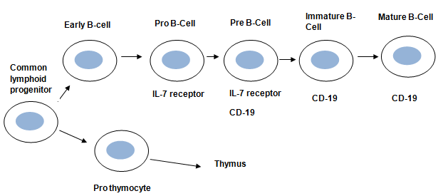 (B-cells and T-cells) are produced and developed from the lymphoid progenitor cells, it is also known as leukocytopoiesis or lymphopoesis. Lymphocytes are formed in the six constituents of the lymphomyeloid complex (LMC) which are namely the bone marrow, thymus, lymph nodes, subepithelial lymphoid tissue, spleen, connective tissue (including blood). The existence of specific markers on the lymphocyte membrane (CD-antigens) has enabled the differentiation of lymphocytic subpopulations. The largest number of the lymphocytes in the peripheral blood belongs to the subpopulations of the mature T-cells. A considerable smaller number of the lymphocytes belong to mature B-cells. The precursors of T- and B-cells are of the least number. Lymphoblast is the earliest morphologically recognizable cell of the lymphocytic lineage. During the lymphocytopoiesis, three developing cell forms can be seen. This process mainly comprises the formation of functional antigen receptors of the T-cells in the thymus and the ability to form and secrete immunoglobulins by the B cells in the bone marrow. Leucopoesis also results in development of natural killer cells (NKC). The process starts with the primitive reticular cell, which on activation developsinto cytoplasmic basophilia and finally becomes a lymphoblast. A series of cell divisions