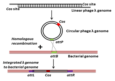 Phage vector is used to carry and replicate foreign DNA inside the bacterial host system. The phage DNA inserts into the host chromosome by recombination. Phage λ had short regions of single-stranded DNA with complementary base sequences called “cohesive” (cos) sites. Base pairing between the complementary cos sites allows the linear genome to form a circle within the host bacterium. Circularized viral genome can be integrated into the bacterial genome by homologous recombination between attP site of viral genome and attB site of bacterial genome.