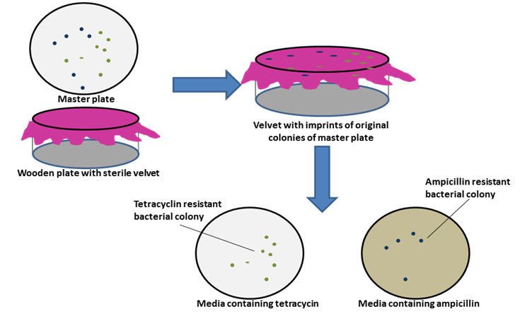 These recombinant cells are selected by replica plating method. The transformed cells are first plated on ampicillin containing medium and after the selection of transformed from non-transformed; the colonies are replica plated on medium containing tetracycline for screening of recombinant clones. After incubation, the viable colonies carrying pBR322 without DNA insert will appear and the positions in plate where the non-viable recombinant clones are present can be easily identified. Using the original master plate, these recombinant clones are picked up and subcultured using the same procedure to obtain a pure recombinant clone.