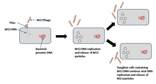 M13 phage is filamentous phage that infects E. coli via F-pilus . The genome is a single stranded circular DNA of size ~6.4kb surrounded by a proteinaceous coat. The DNA strand present in phage is called plus (+) strand. After entering to E. coli host, it converts into double stranded DNA molecule called replicative form (RF) by utilizing bacterial machinery. M13 phage as cloning vector can be obtained in both single stranded as well as double stranded form. Replicative form double stranded vector are modified and replicated inside E. coli host similar to a plasmid vector. Single stranded vectors can be isolated by collecting M13 phage. M13 vectors have useful application in following areas: