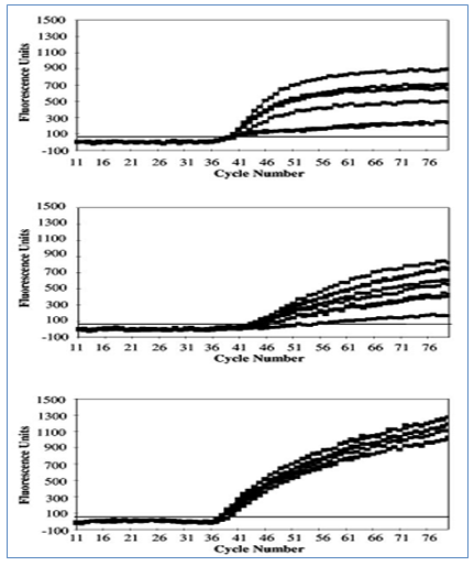 Fig 3-3.2.13: Comparison of symmetric PCR, standard asymmetric PCR, and LATE-PCR (respectively from top to bottom, Reference : Sanchez et al 2004 )