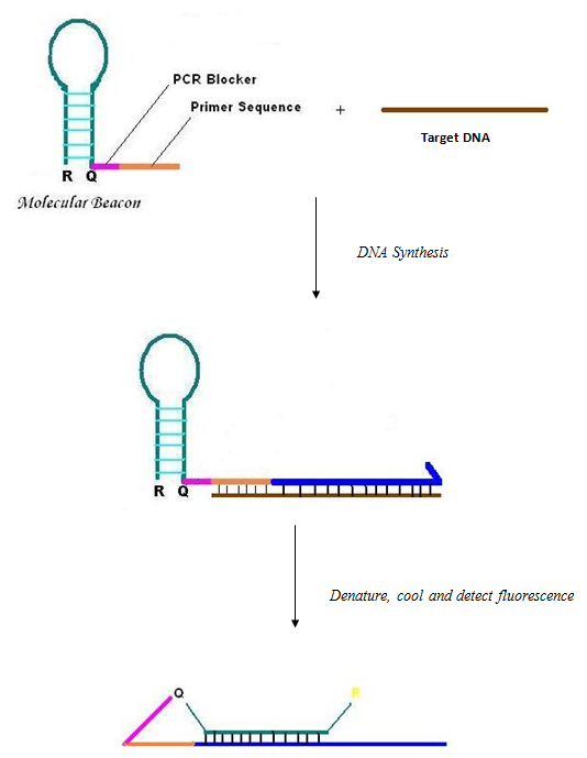 Scorpion primers are similar to Molecular Beacons™, but they contain a PCR primer sequence. When the target DNA is amplified during PCR, the beacon fragment binds to the newly synthesized DNA, and thus, separates the fluorophore from the quencher. To prevent the stem-loop structure from being copied during PCR, a “PCR blocker” is also incorporated in the hairpin. The intra-molecular binding between the scorpion primer and the downstream PCR product is kinetically more favorable than that of Molecular Beacons and TaqMan probes. Unlike the TaqMan and Molecular Beacons, the Scorpion system do not require a separate probe and hence, gives a larger fluorescent signal.