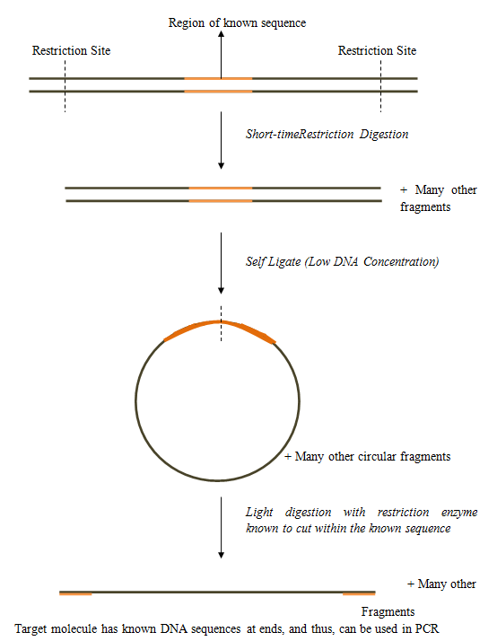The standard PCR suffers from the limitation that the 5' and 3' flanking regions of target DNA must be known. Inverse PCR methodology helps to overcome this drawback by making feasible amplification by a PCR reaction when only one internal sequence is known. It follows standard PCR program, but the primers are oriented in the reverse direction with respect to the normal orientation. A restriction fragment that self-ligates to form a circle serves as the template in this reaction. It involves: