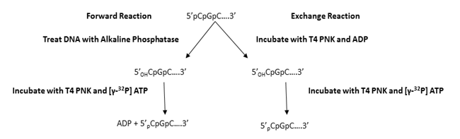 Oligonucleotides are usually end-labeled using polynucleotide kinase. The label is in the form of a 32P isotope at the γ-phosphate position of ATP. The polynucleotide kinase catalyzes an exchange reaction with the 5′-terminal phosphates at high concentration of dADP and low concentration of dATP. Alkaline phosphatase such as calf intestinal phosphatase (CIP) or shrimp alkaline phosphatase (SAP) can be used to remove 5' phosphate group and polynucleotide kinase (PNK) is used to add labeled phosphate using labeled dATP.