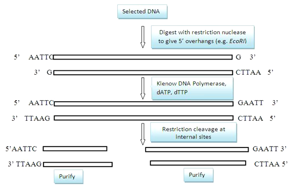 The same methodology is used for labeling double stranded DNA. Fragments which carry label at one end can only be generated using restriction enzyme which cleaves at internal sites, thus producing two fragments which can be separated by gel electrophoresis and purified. Fill-in end labeling is a popular approach to label large DNA fragments using Klenow subunit of E. coli DNA polymerase.