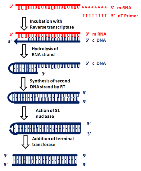 The ds-cDNA can be trimmed with S1 nuclease to obtain blunt–ended ds-cDNA molecule followed by addition of terminal transferase to tail the cDNA with C's and ligation into a vector.