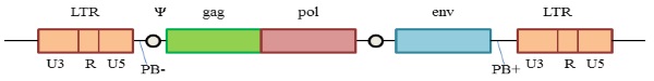 Figure 5-1.4.4(c): An oncoretrovirus genome comprising long terminal repeats (LTRs) enclosing the three open reading frames gag, pol and env. PB represents primer binding sites in the viral replication cycle, ψ is the packaging signal and small circles represent splice sites.