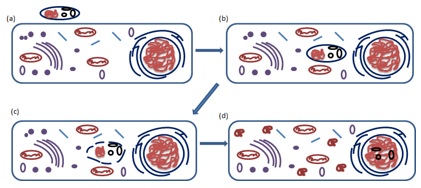 Figure 5-1.2: The process of bactofection (a) the transformed bacterial strain with plasmid containing transgene is transferred to target cell (b) genetically engineered bacteria penetrates into the cell (c) In the cytoplasm, the vector undergoes lysis and get destructed releasing plasmids (d) The released plasmids enter into the nucleus where the transgene is expressed by eukaryotic transcription and translation machinery.