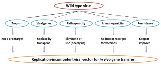 Figure 5-1.3.2(b): Modifications required for the generation of replication-defective viral vectors from wild type virus for in vivo gene transfer.