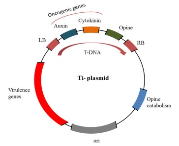 The virulent strains of A. tumefaciens harbor large plasmids (140–235 kbp) known as tumor-inducing (Ti) plasmid involving elements like T-DNA, vir region, origin of replication, region enabling conjugative transfer and o-cat region (required for catabolism of opines).