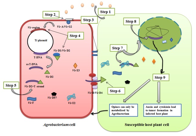 Figure 5-4.3: Schematic representation of Agrobacterium- mediated transformation. Step 1: Production of signal molecules form wounded plant cell; Step 2: Recognition of signal molecules by bacterial receptors; Step 3: Attachment of Agrobacterium to plant cell; Step 4: Activation of Vir proteins which process ss-TDNA; Step 5: Formation of immature T-complex; Step 6: T-DNA transfer; Step 7: Assembly of mature T-complex and Nuclear transport; Step 8: Random T-DNA integration in the plant genome; Step 9: Expression of bacterial genes and synthesis of bacterial proteins.