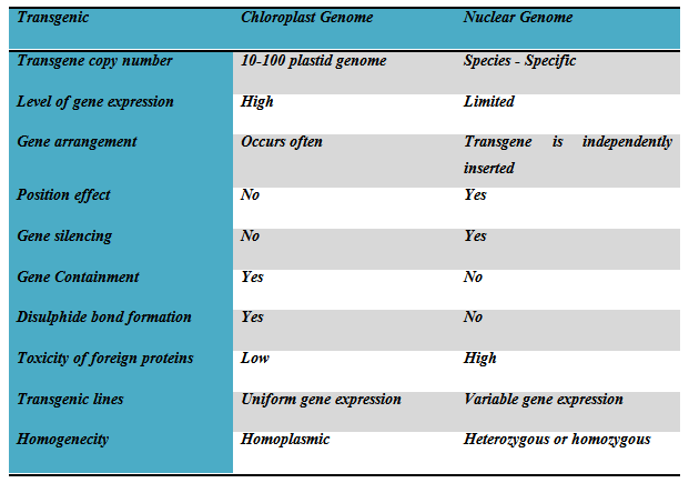 Table 5-5.5: Differences between chloroplast and nuclear genetic engineering