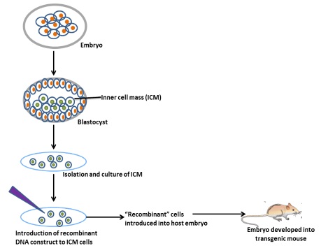 DNA microinjection technique was first described in 1966 by T. P. Lin, which paved the way of generating transgenic animal by direct introduction of foreign DNA into the host cell. Linearized DNA construct is injected into the cell which finally integrates to the host genome at random sites by homologous recombination. DNA microinjection can be targeted to two sites: Pronuclear injection and cytoplasmic injection. Following steps are involved in production of transgenic animal by microinjection: