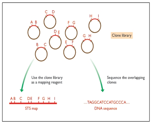 Figure 6-5.3(b).3.2: Clone libraries used in the construction of STS maps and also as a source of DNA to be sequenced. (Source: Brown TA. 2002. Genomes. 2nd ed. Oxford: Wiley-Liss )